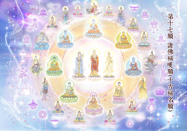 經中說:「我作佛時,十方世界,無量剎中,無數諸佛,若不共稱歎我名,說我功德國土之善者,不取正覺。(十七、諸佛稱歎願)